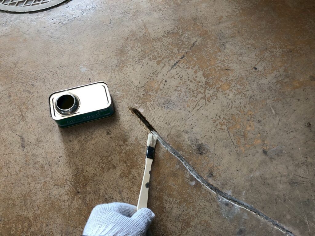 モルタル補修後、コンクリートや強化コンクリート床面への付着性に優れたプライマー(接着剤)を塗布しました。