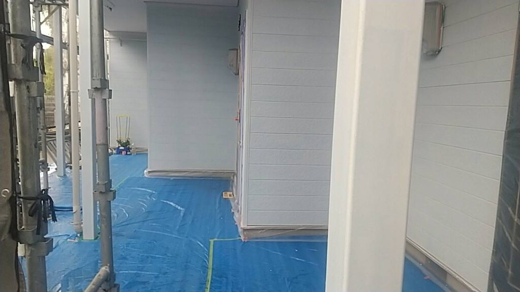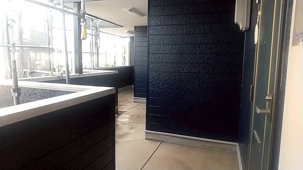 これで、Iさんは、もちろん住民の皆さんも安心して住むことが出来ますね。外壁のネイビーと付帯部のホワイトがアクセントになり、とてもおしゃれになりました。また追加の工事をご依頼頂きありがとうございます。